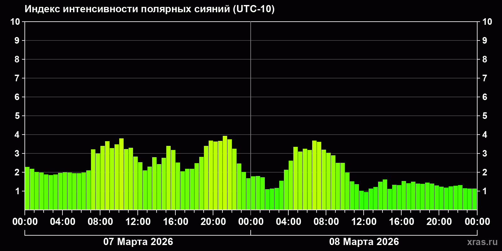 Изменения индекса интенсивности полярных сияний с 2026-03-07 по 2026-03-08 по местному времени