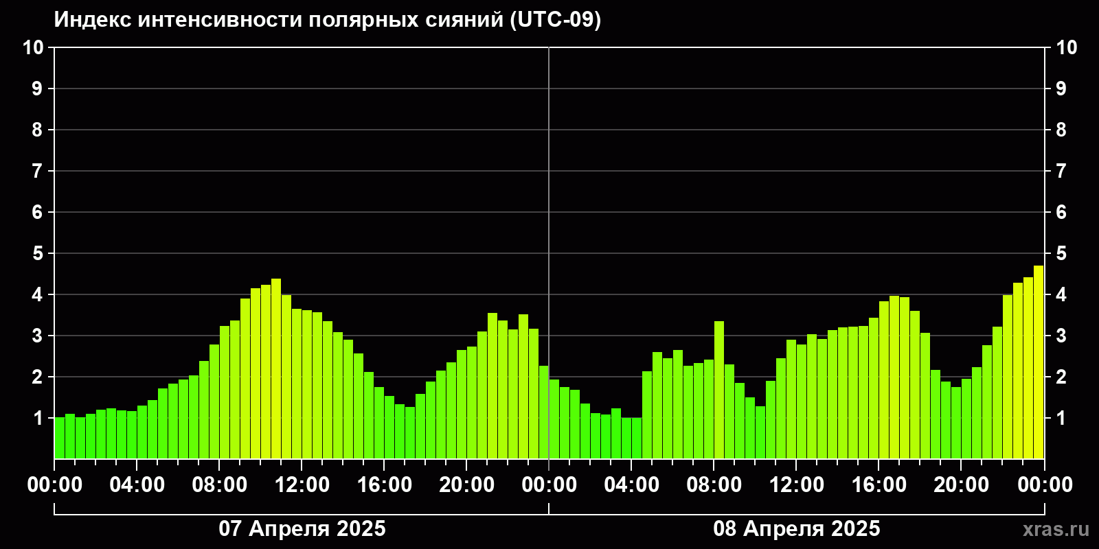 Изменения индекса интенсивности полярных сияний с 2025-04-07 по 2025-04-08 по местному времени