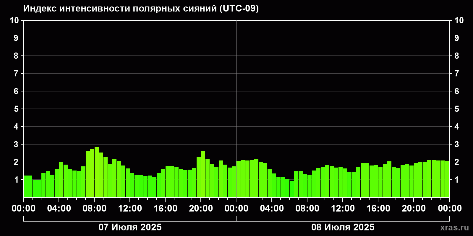 Изменения индекса интенсивности полярных сияний с 2025-07-07 по 2025-07-08 по местному времени