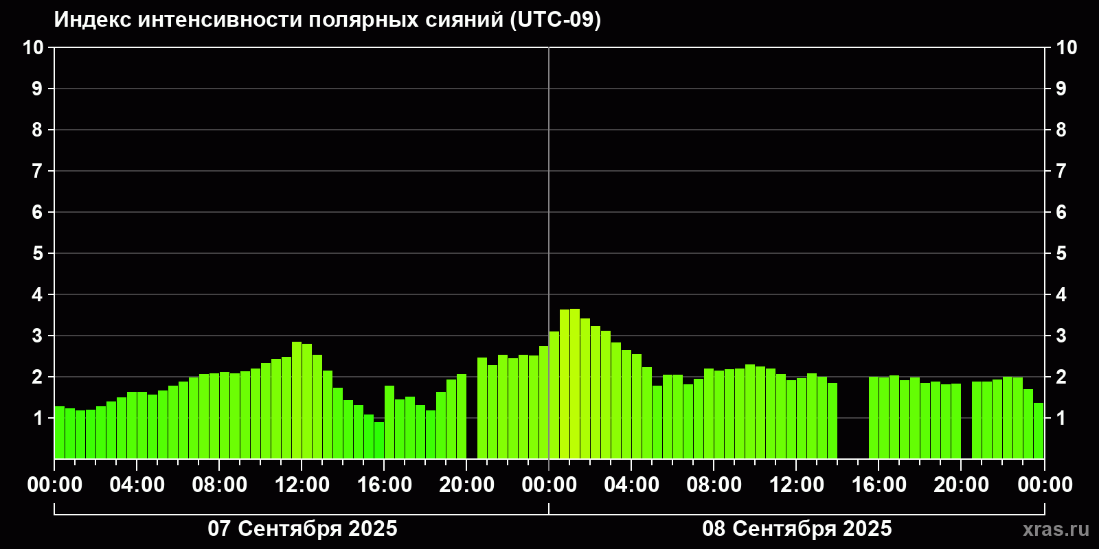 Изменения индекса интенсивности полярных сияний с 2025-09-07 по 2025-09-08 по местному времени