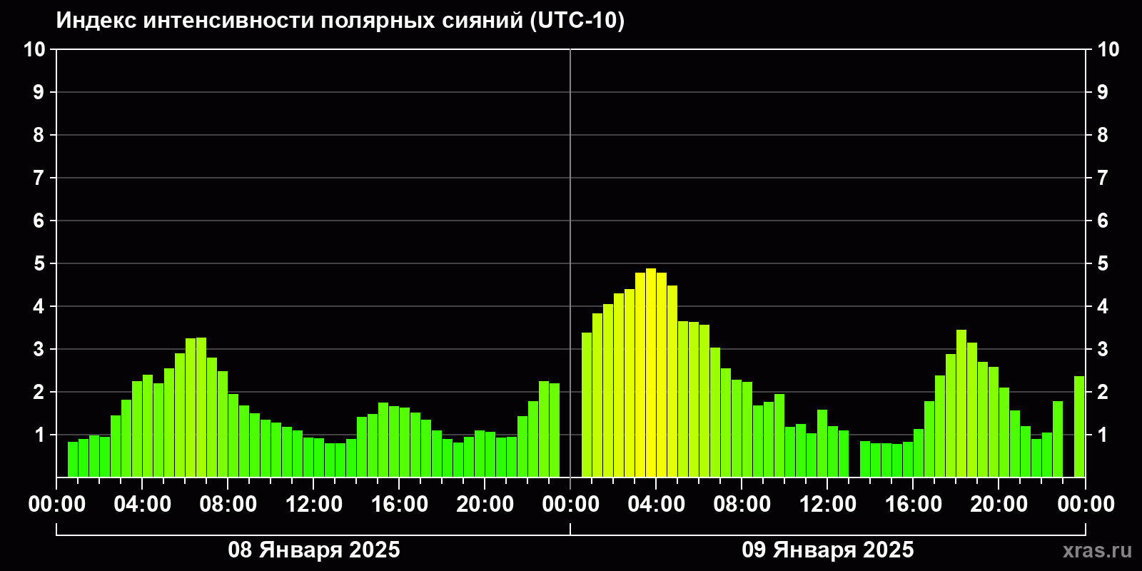Изменения индекса интенсивности полярных сияний с 2025-01-08 по 2025-01-09 по местному времени