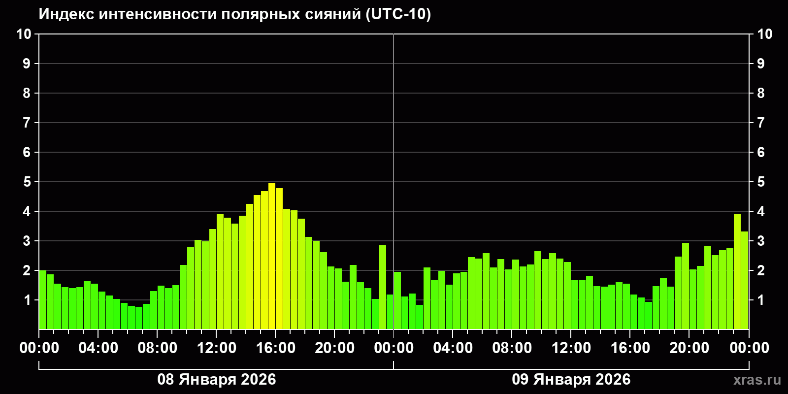 Изменения индекса интенсивности полярных сияний с 2026-01-08 по 2026-01-09 по местному времени