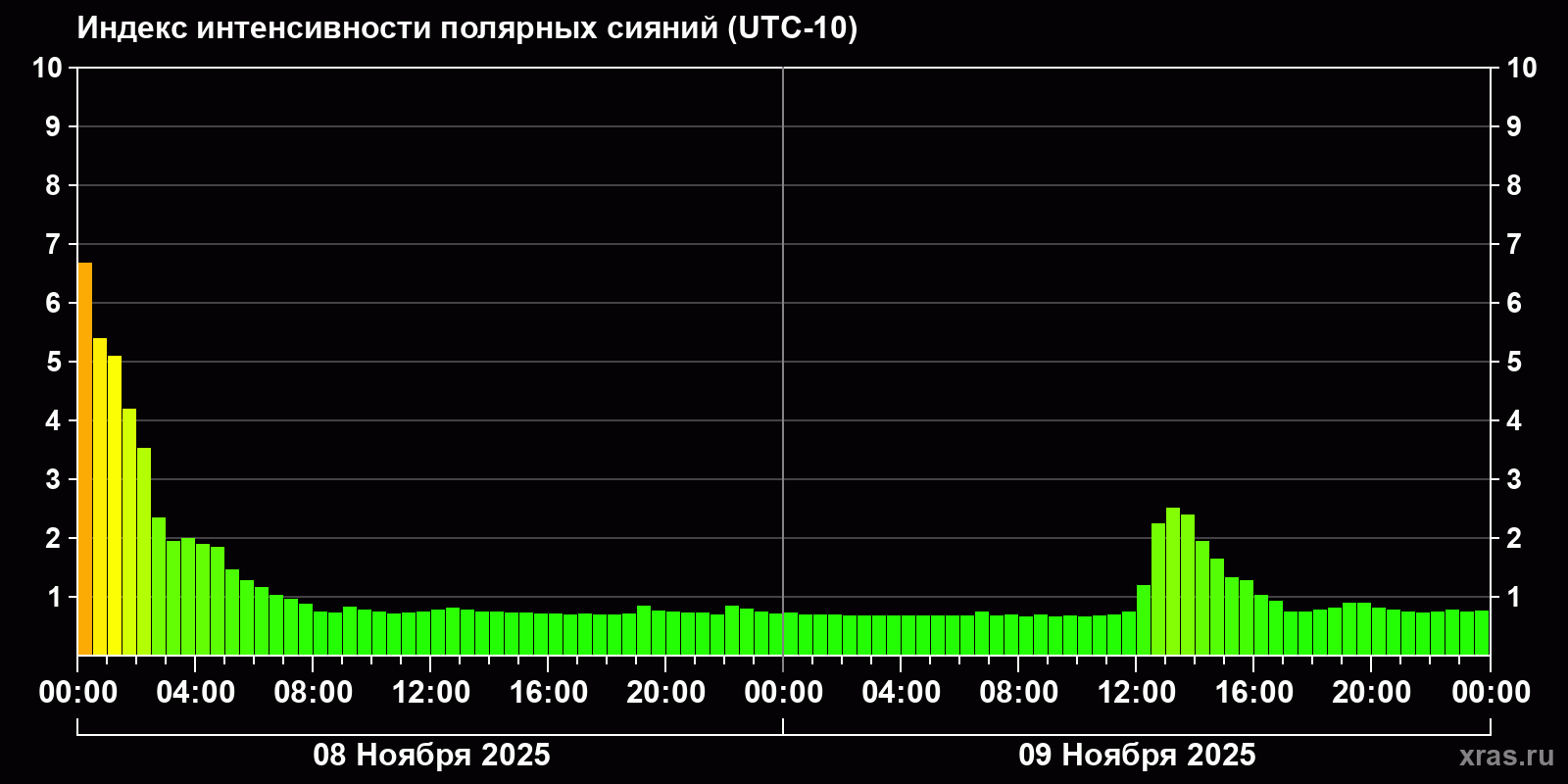 Изменения индекса интенсивности полярных сияний с 2025-11-08 по 2025-11-09 по местному времени