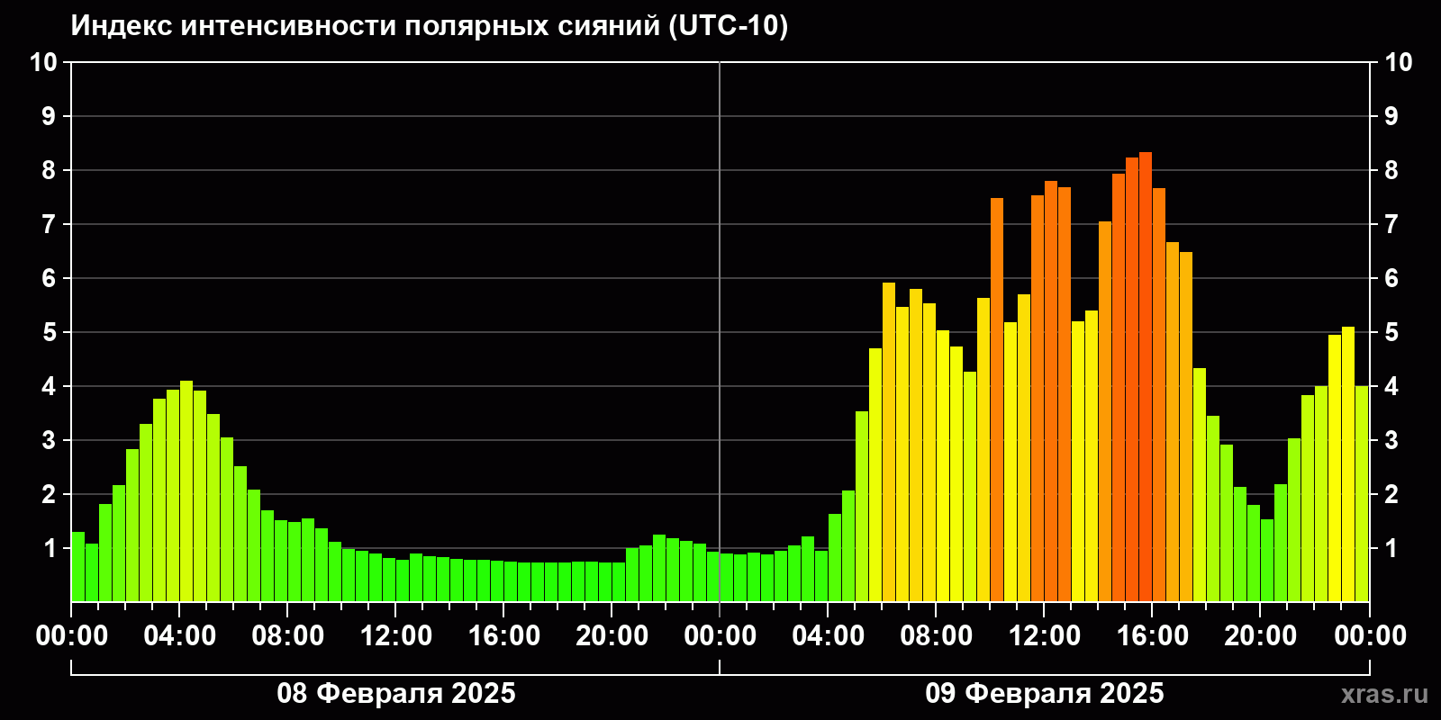 Изменения индекса интенсивности полярных сияний с 2025-02-08 по 2025-02-09 по местному времени