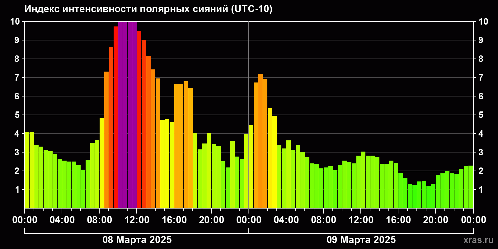 Изменения индекса интенсивности полярных сияний с 2025-03-08 по 2025-03-09 по местному времени