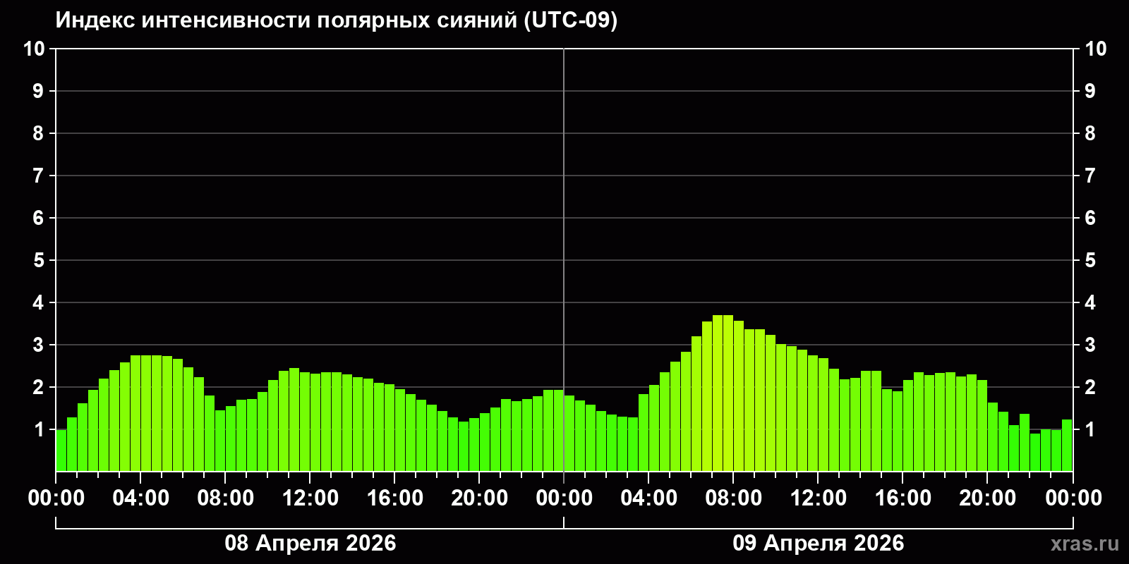 Изменения индекса интенсивности полярных сияний с 2026-04-08 по 2026-04-09 по местному времени