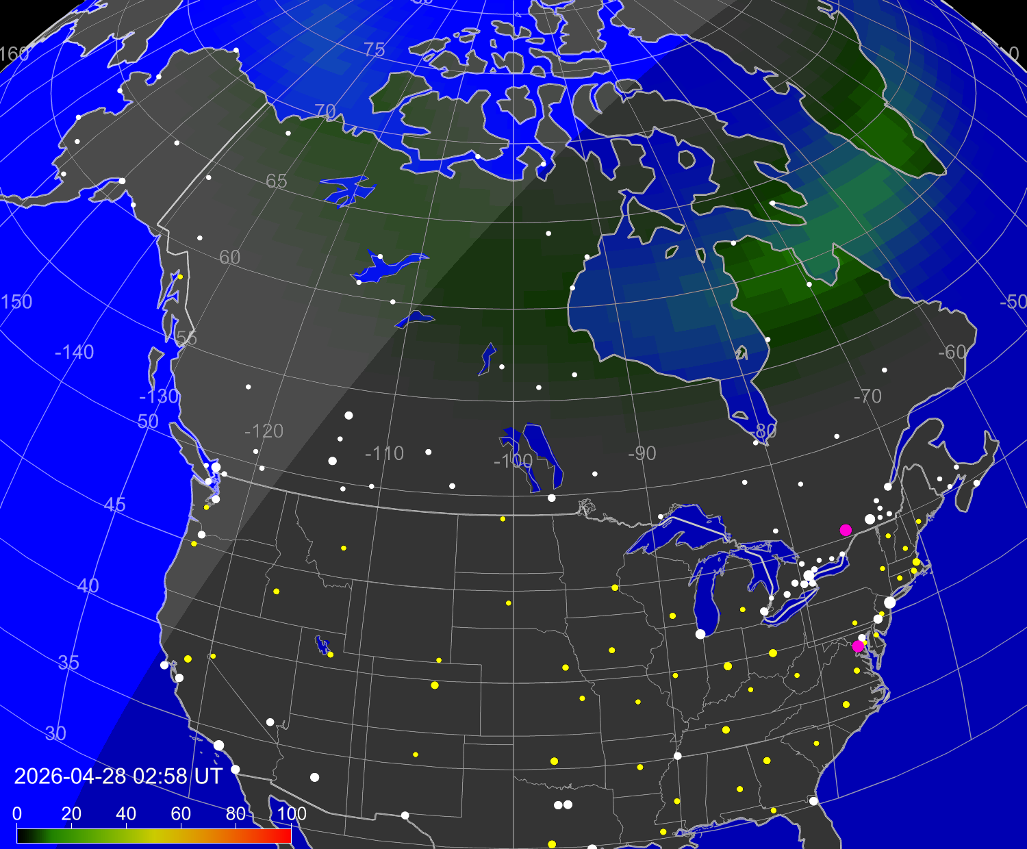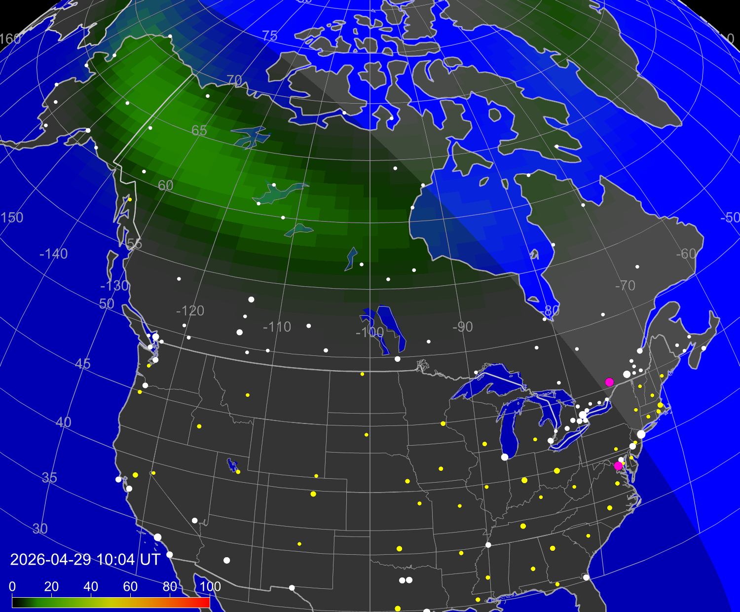 Индекс интенсивности полярных сияний и теоретически возможная широта наблюдений для ночного времени в западном полушарии