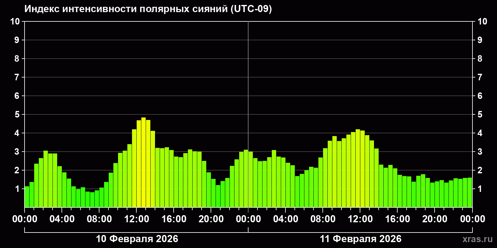 Изменения индекса интенсивности полярных сияний с 2026-02-10 по 2026-02-11 по местному времени