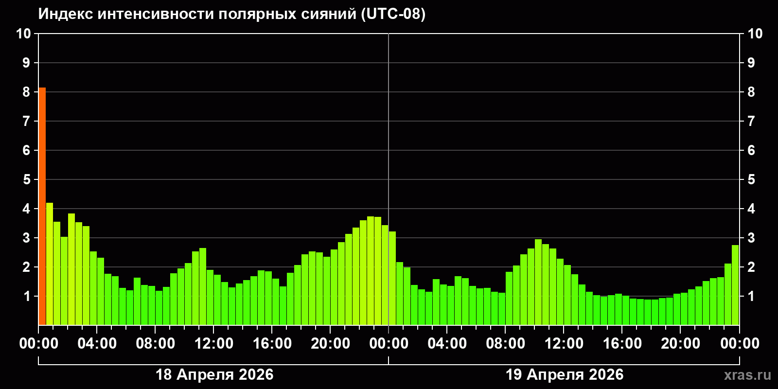 Изменения индекса интенсивности полярных сияний с 2026-04-18 по 2026-04-19 по местному времени