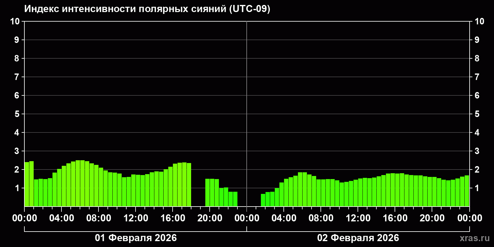 Изменения индекса интенсивности полярных сияний с 2026-02-01 по 2026-02-02 по местному времени