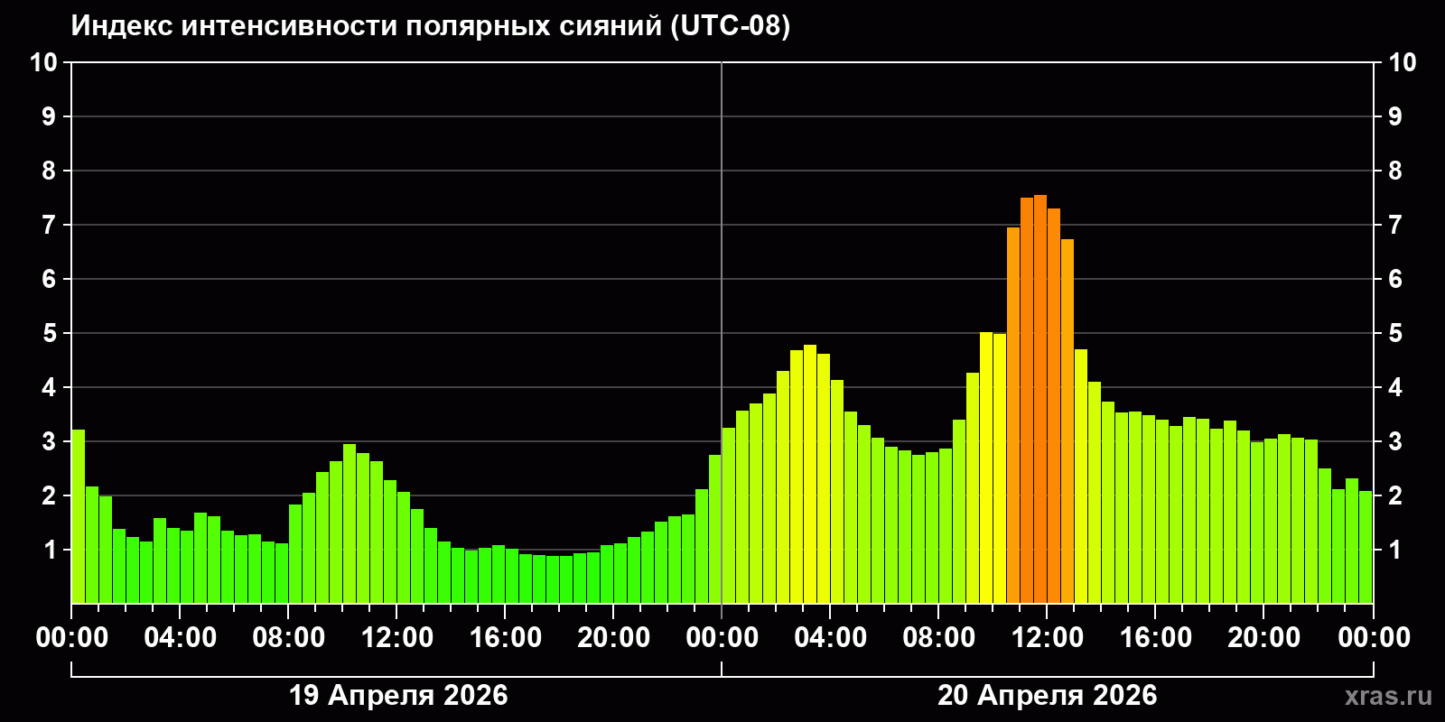 Изменения индекса интенсивности полярных сияний с 2026-04-19 по 2026-04-20 по местному времени