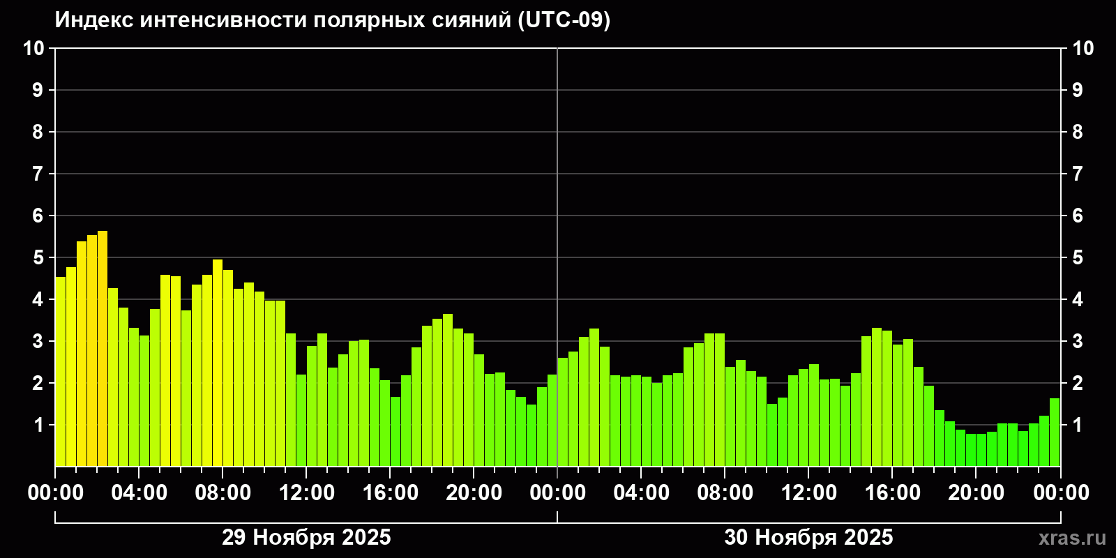 Изменения индекса интенсивности полярных сияний с 2025-11-29 по 2025-11-30 по местному времени