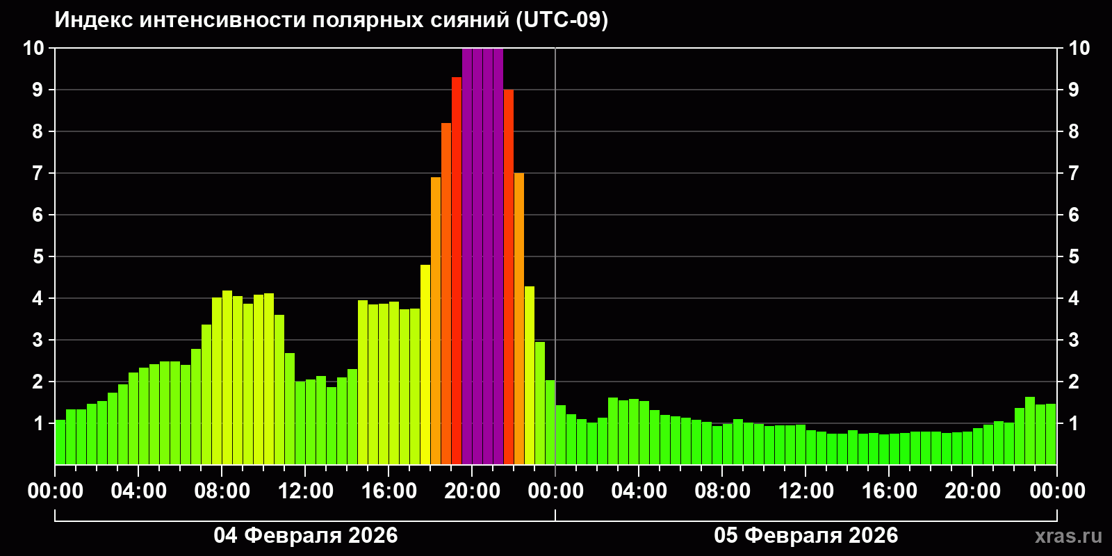 Изменения индекса интенсивности полярных сияний с 2026-02-04 по 2026-02-05 по местному времени