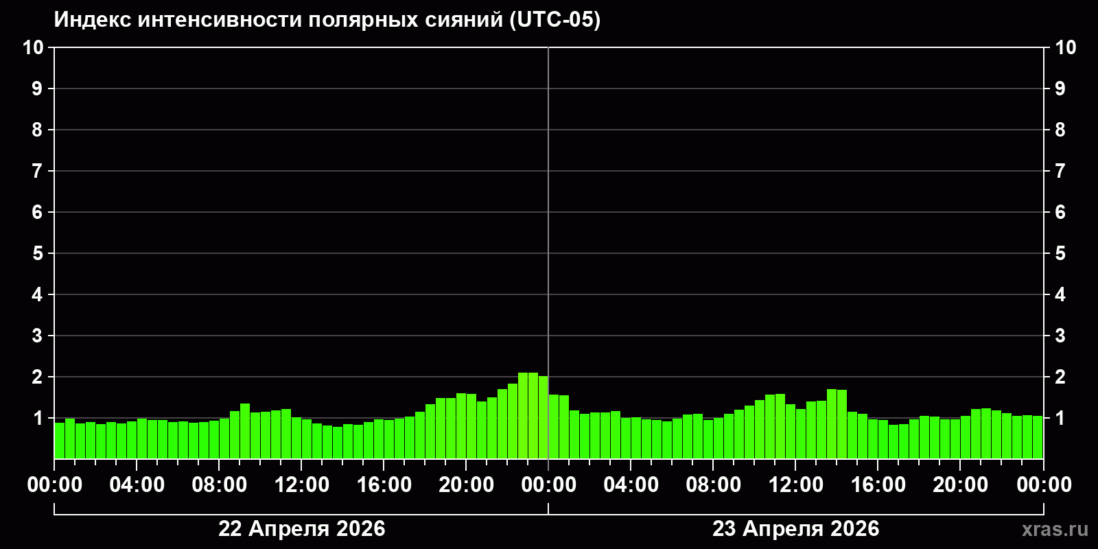 Изменения индекса интенсивности полярных сияний с 2026-04-22 по 2026-04-23 по местному времени