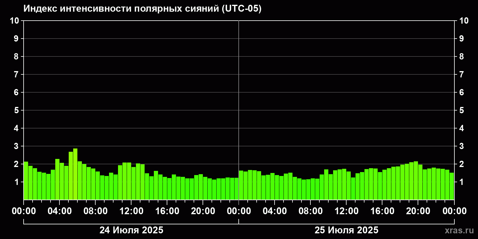 Изменения индекса интенсивности полярных сияний с 2025-07-24 по 2025-07-25 по местному времени