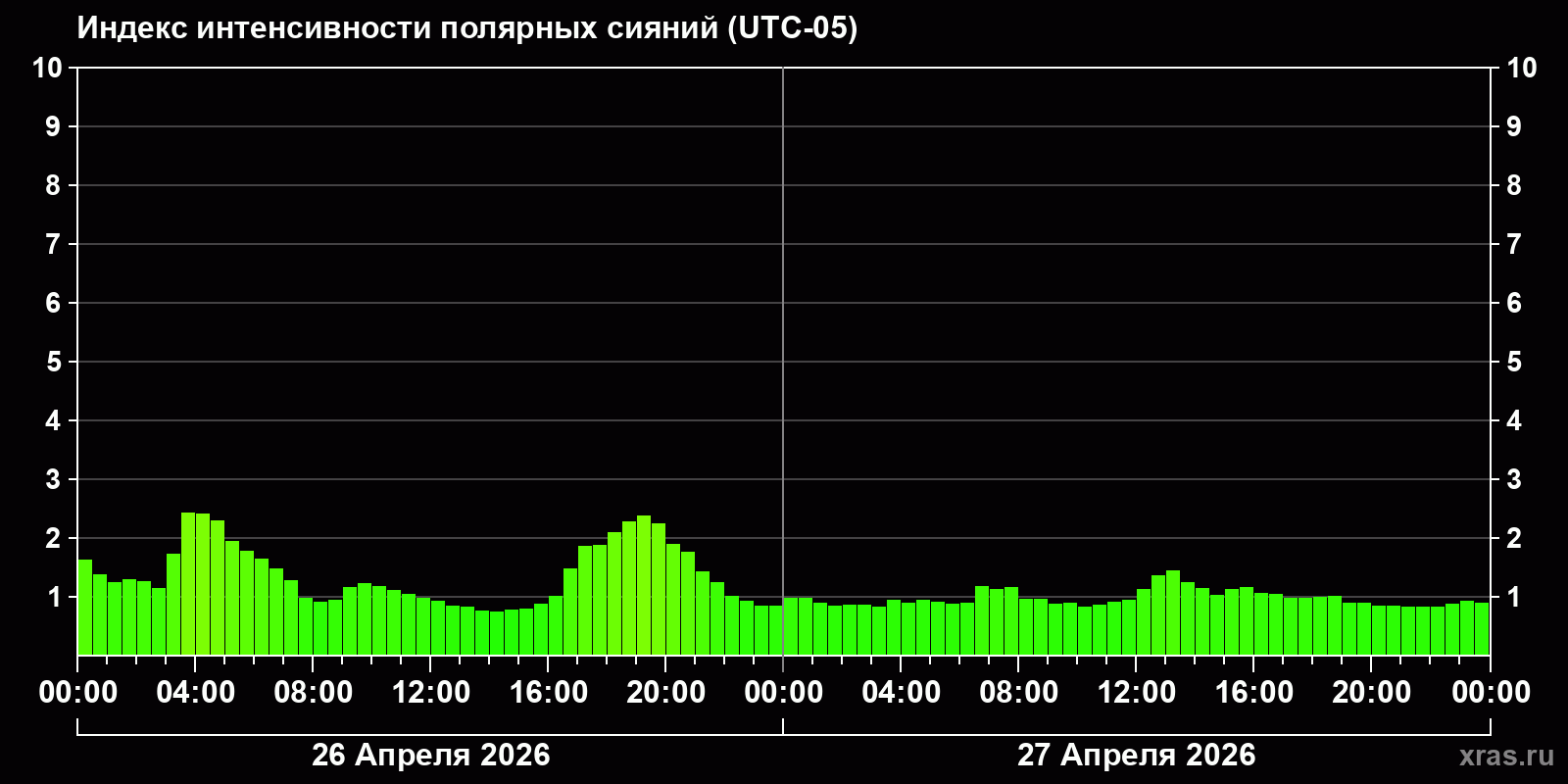 Изменения индекса интенсивности полярных сияний с 2026-04-26 по 2026-04-27 по местному времени