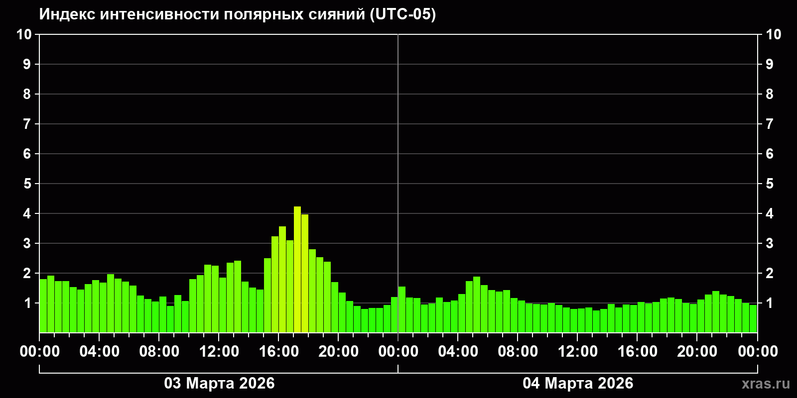 Изменения индекса интенсивности полярных сияний с 2026-03-03 по 2026-03-04 по местному времени