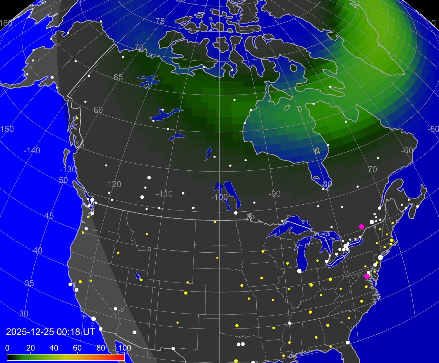 Вероятность полярных сияний в городах Канады