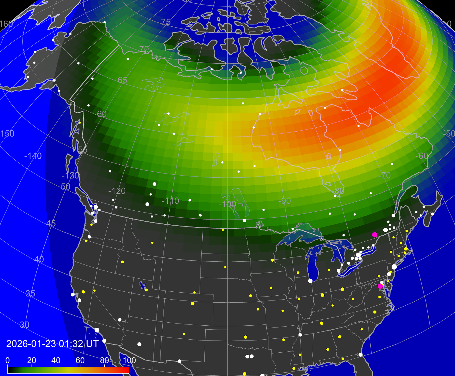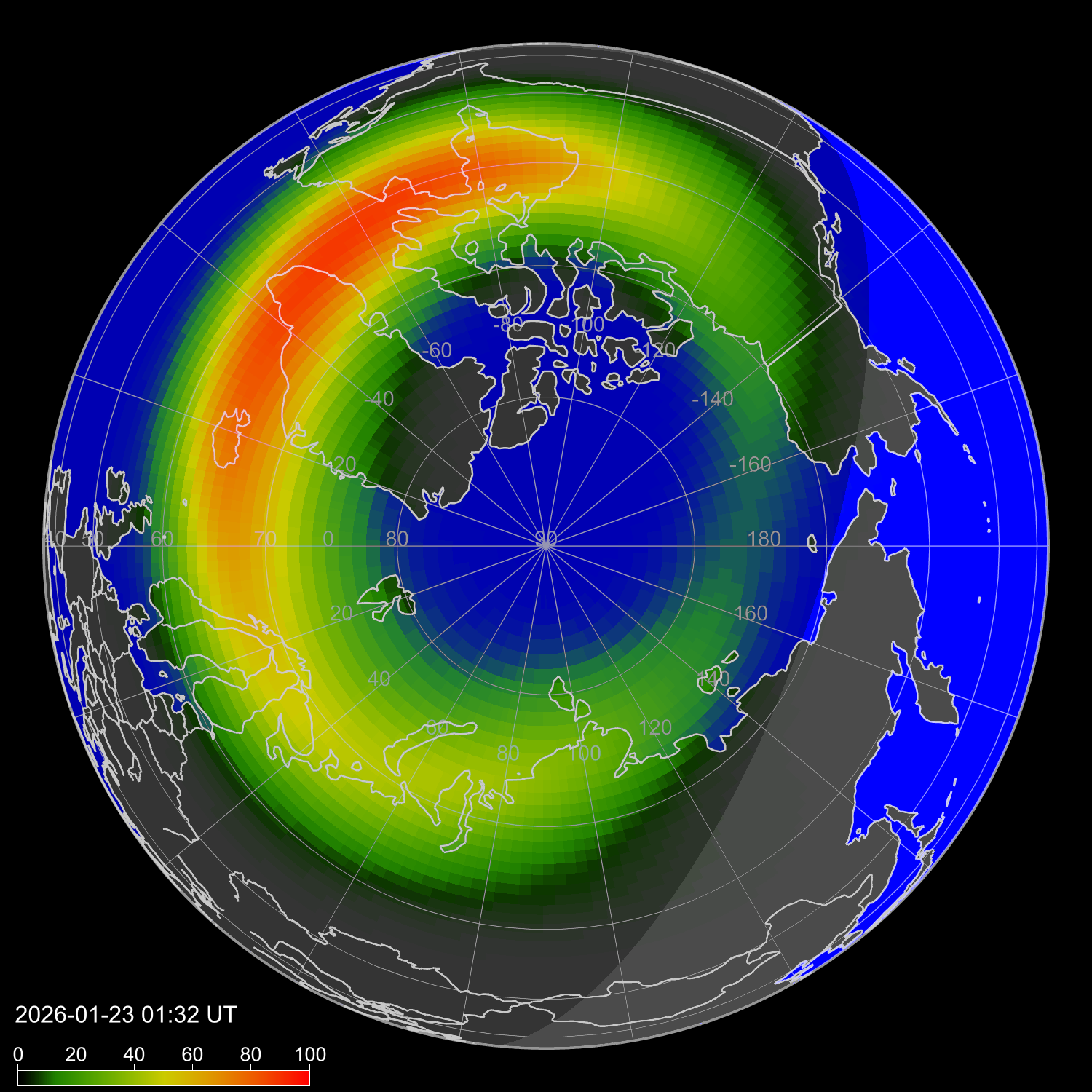Индекс интенсивности полярных сияний и теоретически возможная широта наблюдений для ночного времени в западном полушарии