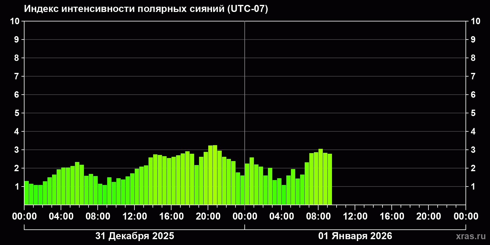 Изменения индекса интенсивности полярных сияний с 2025-12-31 по 2026-01-01 по местному времени