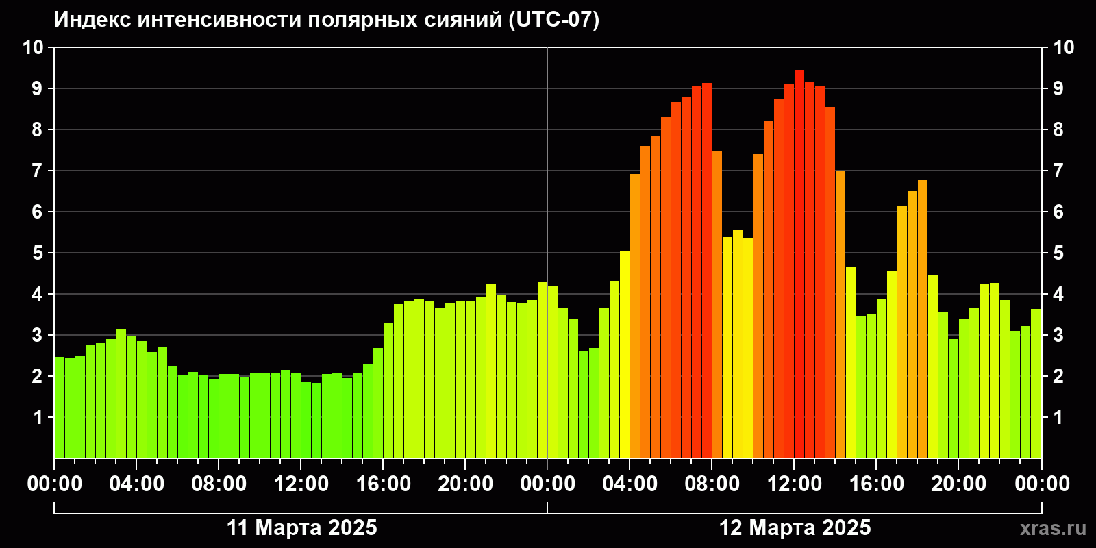 Изменения индекса интенсивности полярных сияний с 2025-03-11 по 2025-03-12 по местному времени