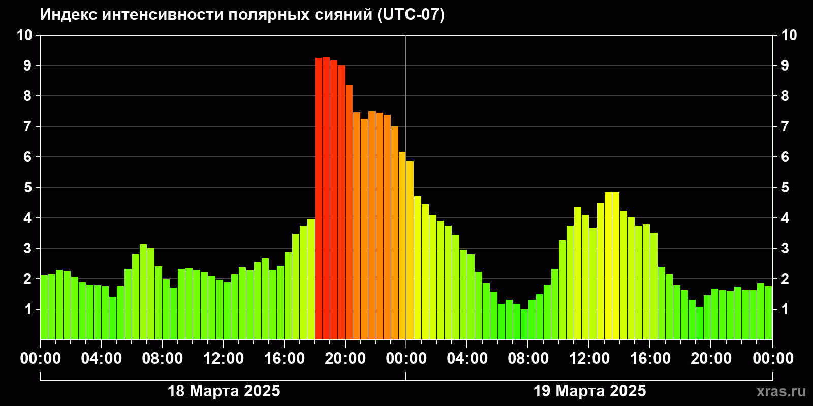 Изменения индекса интенсивности полярных сияний с 2025-03-18 по 2025-03-19 по местному времени