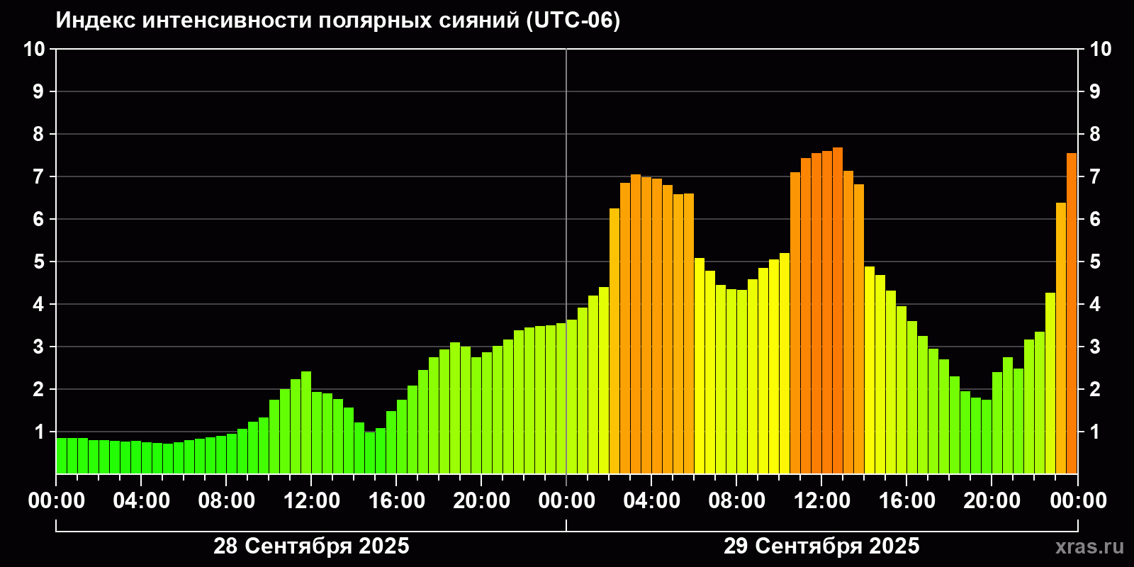 Изменения индекса интенсивности полярных сияний с 2025-09-28 по 2025-09-29 по местному времени