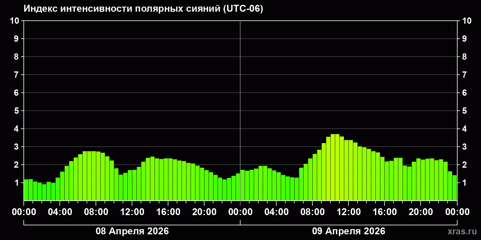 Изменения индекса интенсивности полярных сияний с 2026-04-08 по 2026-04-09 по местному времени
