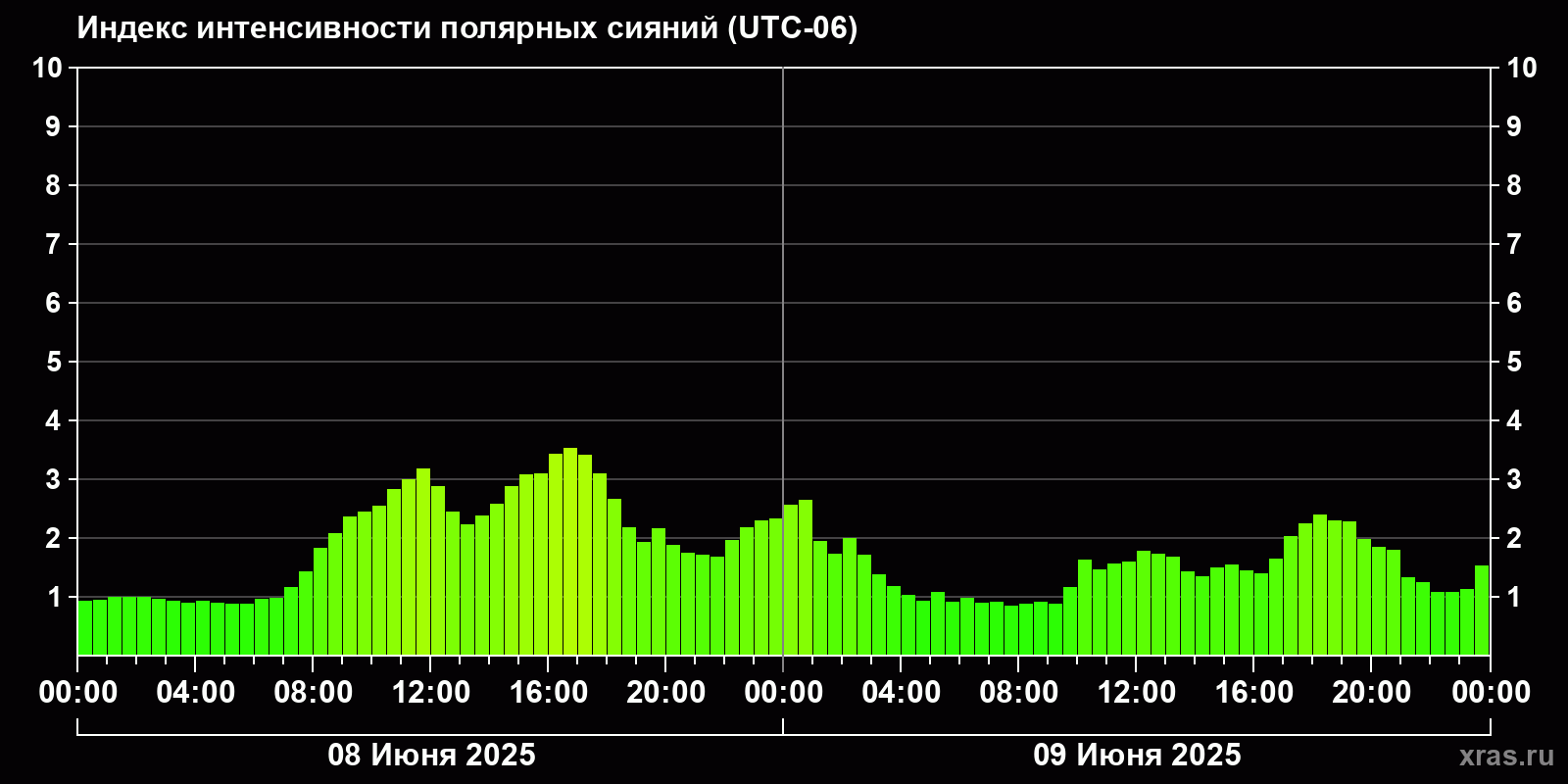Изменения индекса интенсивности полярных сияний с 2025-06-08 по 2025-06-09 по местному времени
