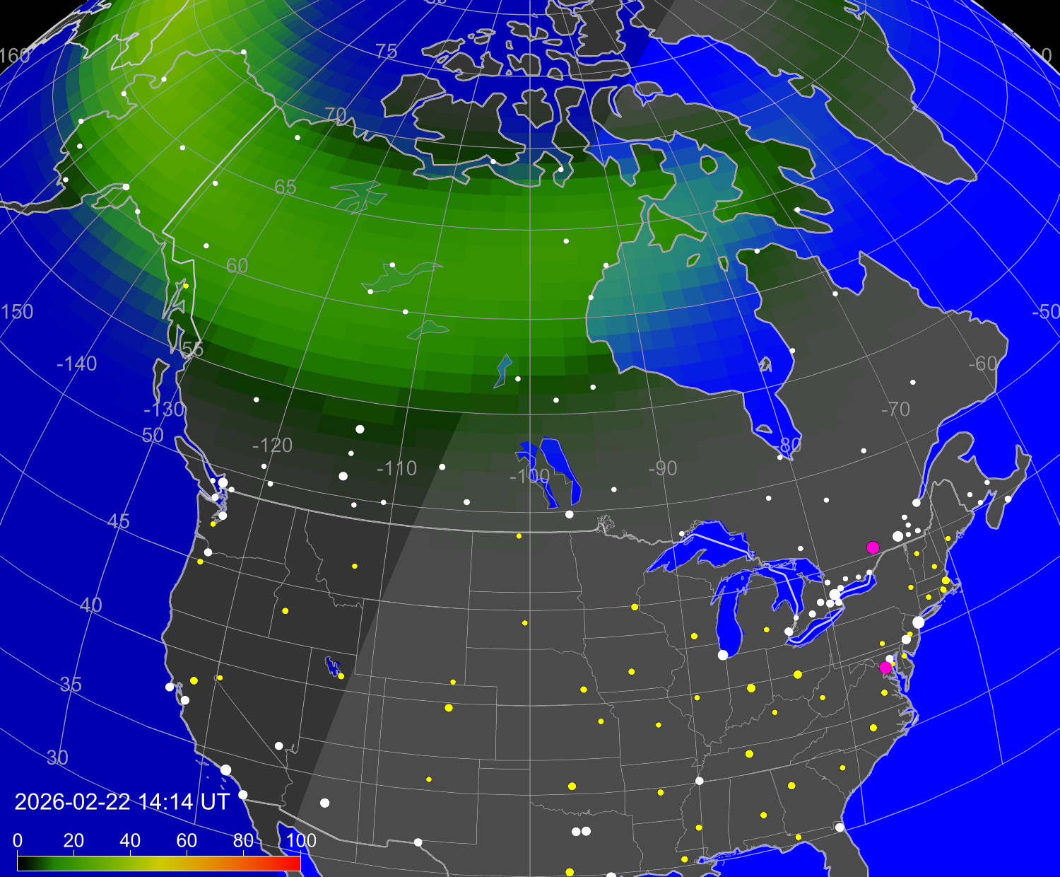 Вероятность полярных сияний в городах Канады