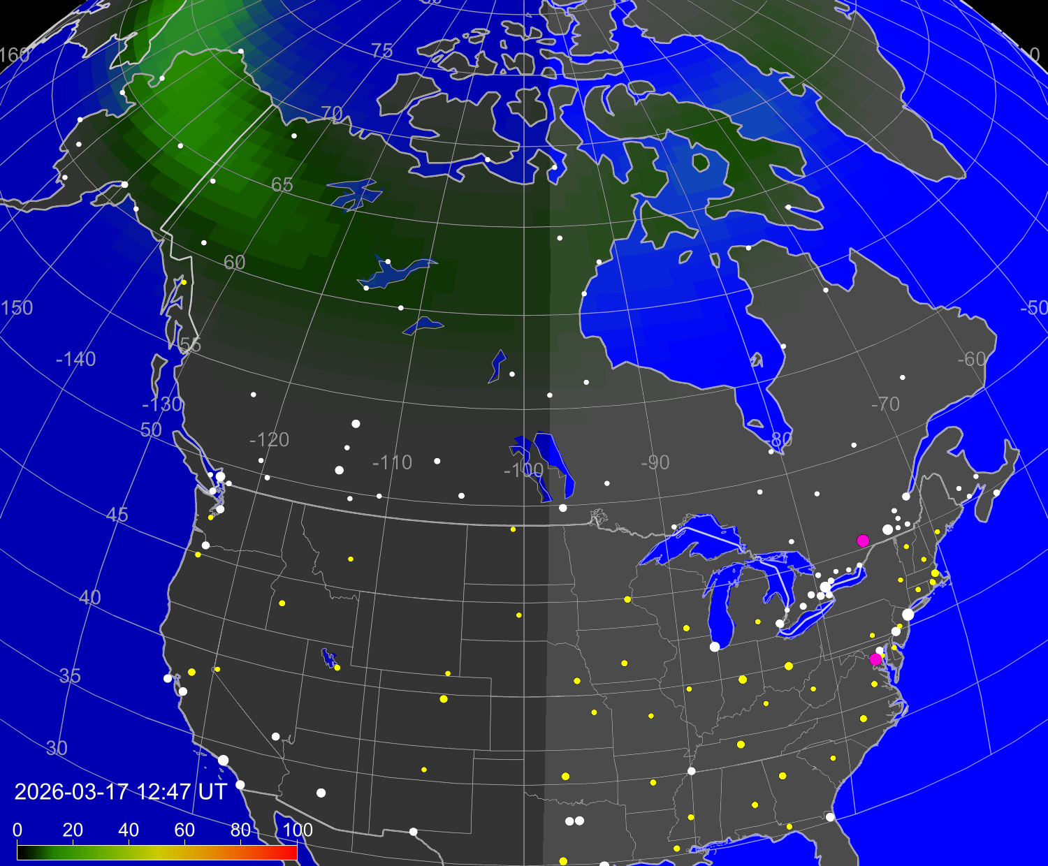 Зона полярных (северных) сияний над территорией Северной Америки