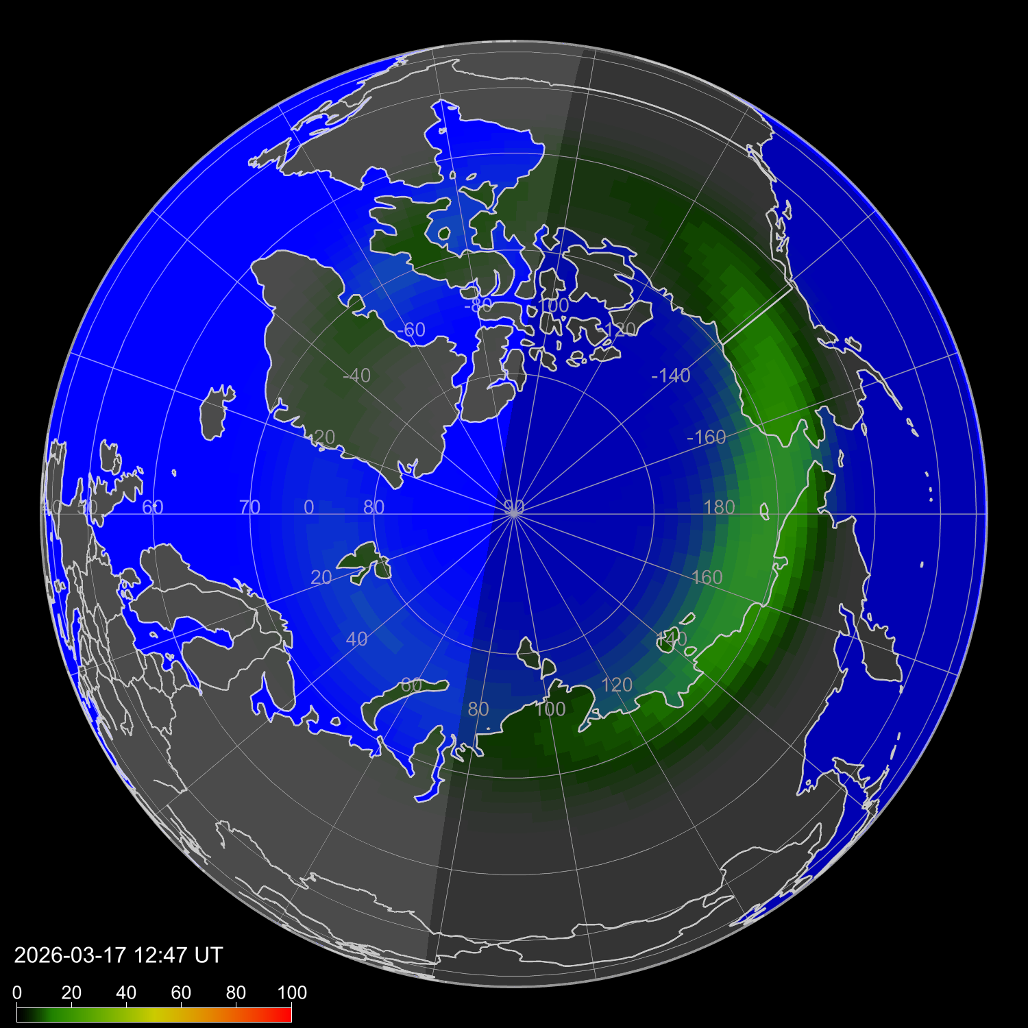 Индекс интенсивности полярных сияний и теоретически возможная широта наблюдений для ночного времени в западном полушарии