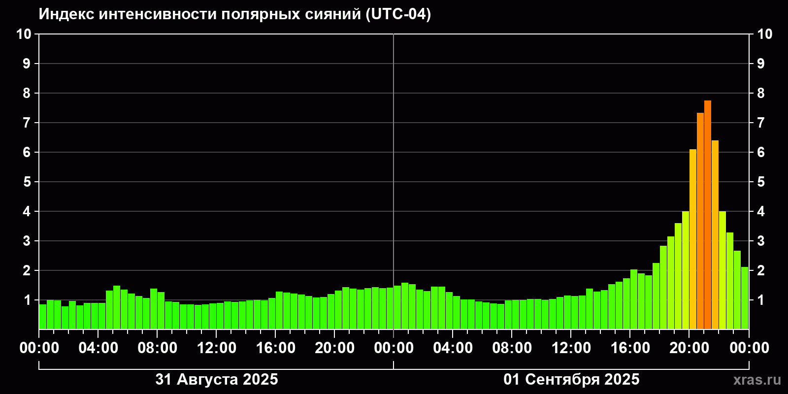 Изменения индекса интенсивности полярных сияний с 2025-08-31 по 2025-09-01 по местному времени