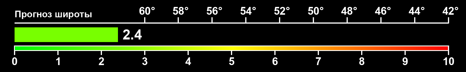 Индекс интенсивности полярных сияний и теоретически возможная широта наблюдений для ночного времени в западном полушарии по состоянию на 2026-03-12 23:47 (конец дня) по местному времени