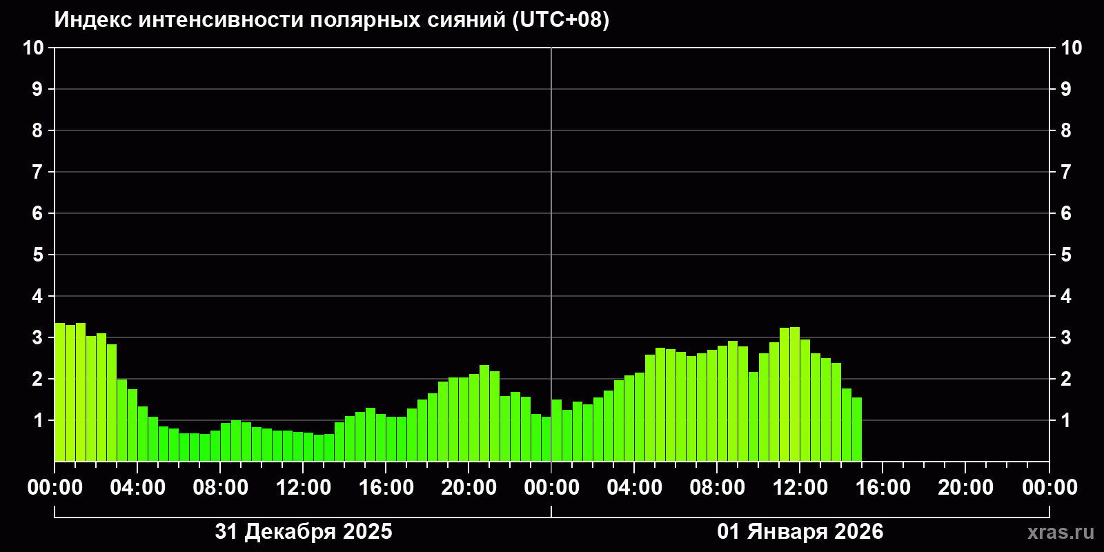 Изменения индекса интенсивности полярных сияний с 2025-12-31 по 2026-01-01 по местному времени