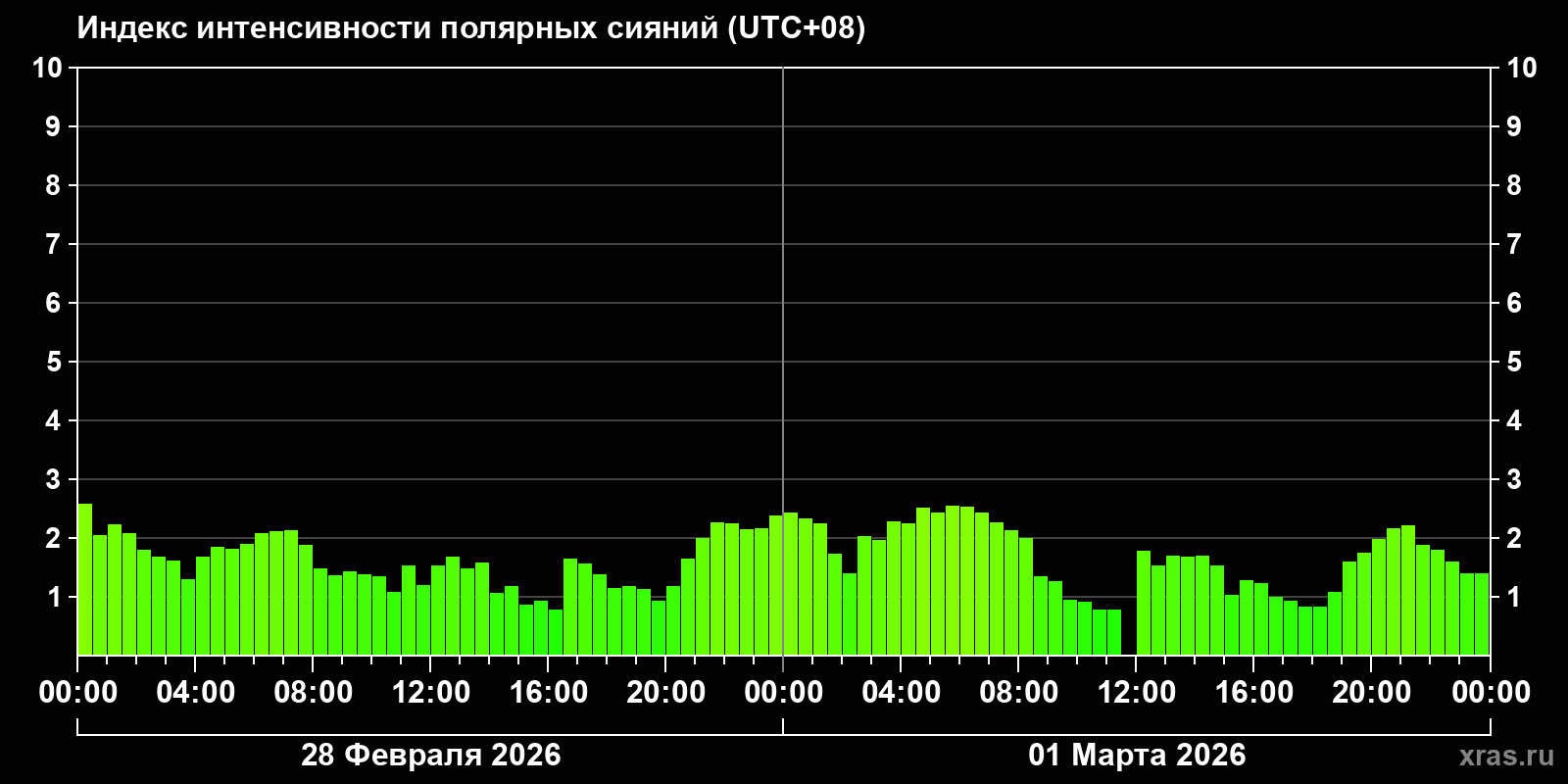 Изменения индекса интенсивности полярных сияний с 2026-02-28 по 2026-03-01 по местному времени