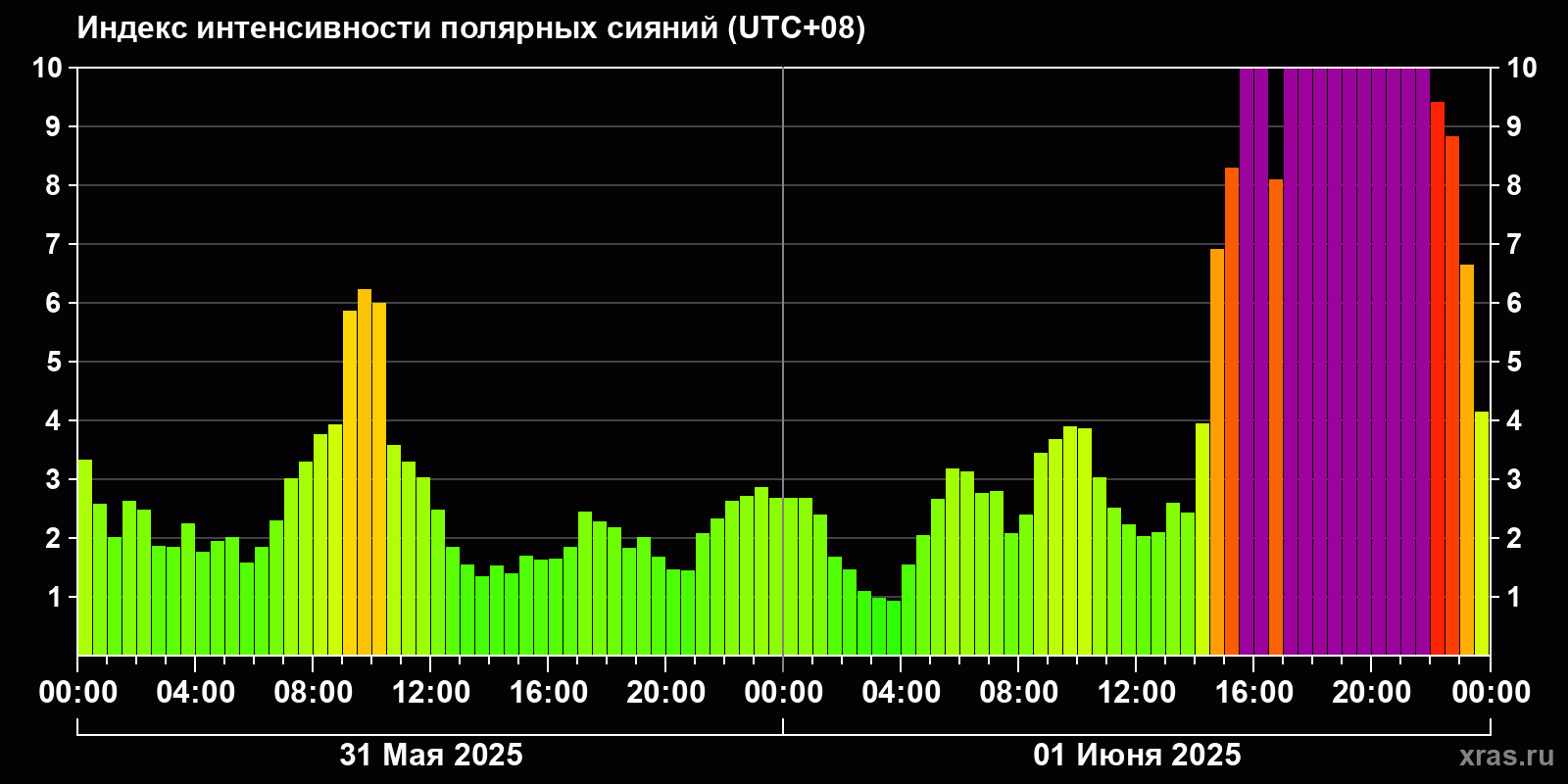 Изменения индекса интенсивности полярных сияний с 2025-05-31 по 2025-06-01 по местному времени