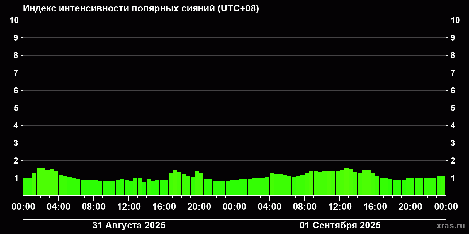Изменения индекса интенсивности полярных сияний с 2025-08-31 по 2025-09-01 по местному времени