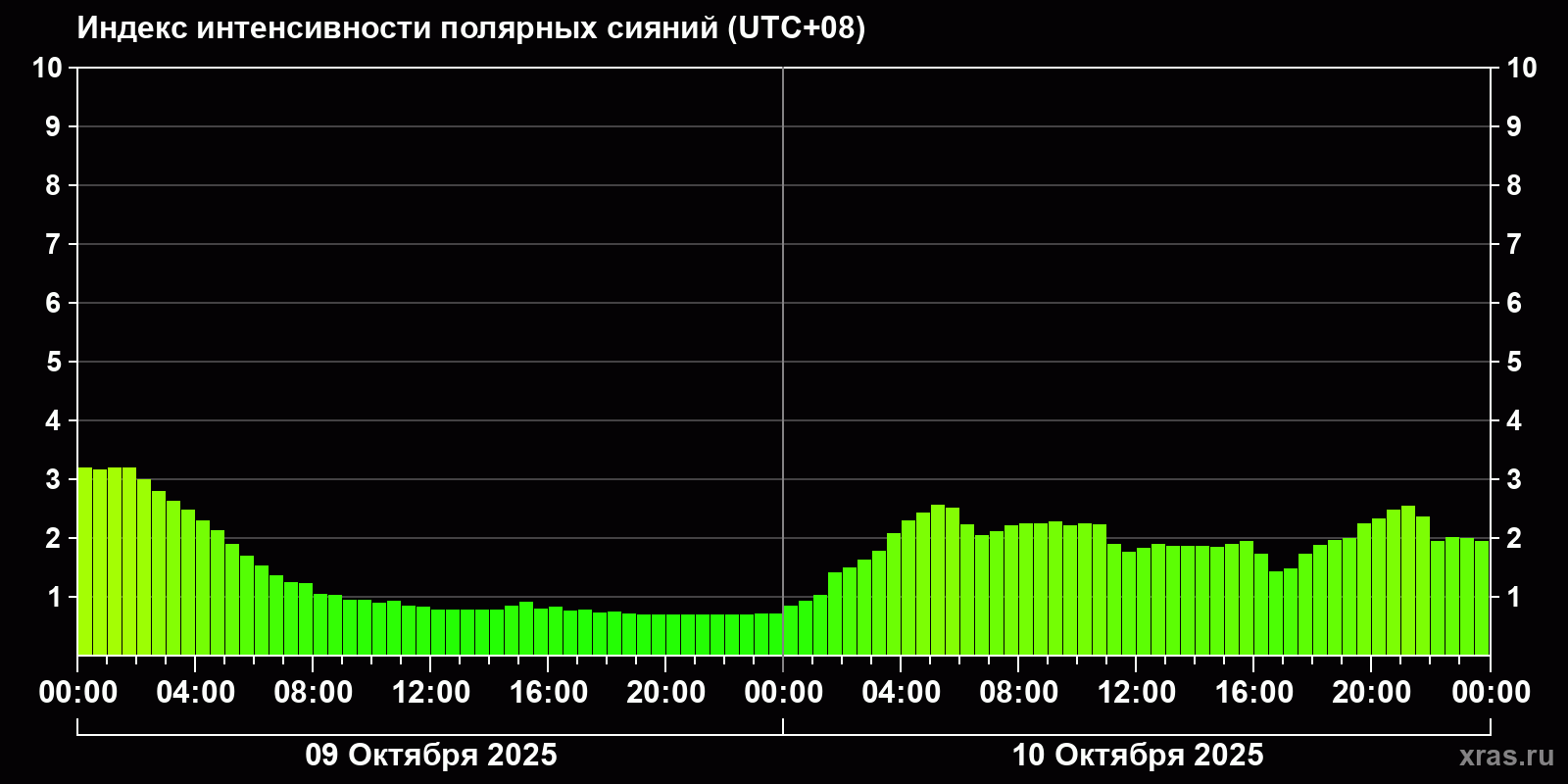 Изменения индекса интенсивности полярных сияний с 2025-10-09 по 2025-10-10 по местному времени