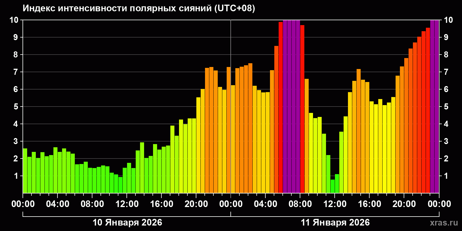Изменения индекса интенсивности полярных сияний с 2026-01-10 по 2026-01-11 по местному времени