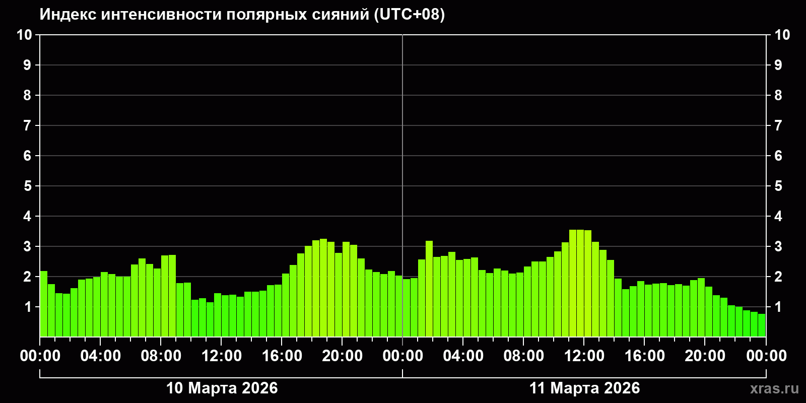 Изменения индекса интенсивности полярных сияний с 2026-03-10 по 2026-03-11 по местному времени