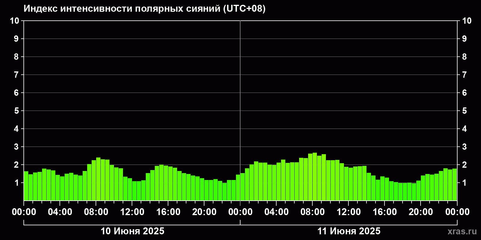 Изменения индекса интенсивности полярных сияний с 2025-06-10 по 2025-06-11 по местному времени