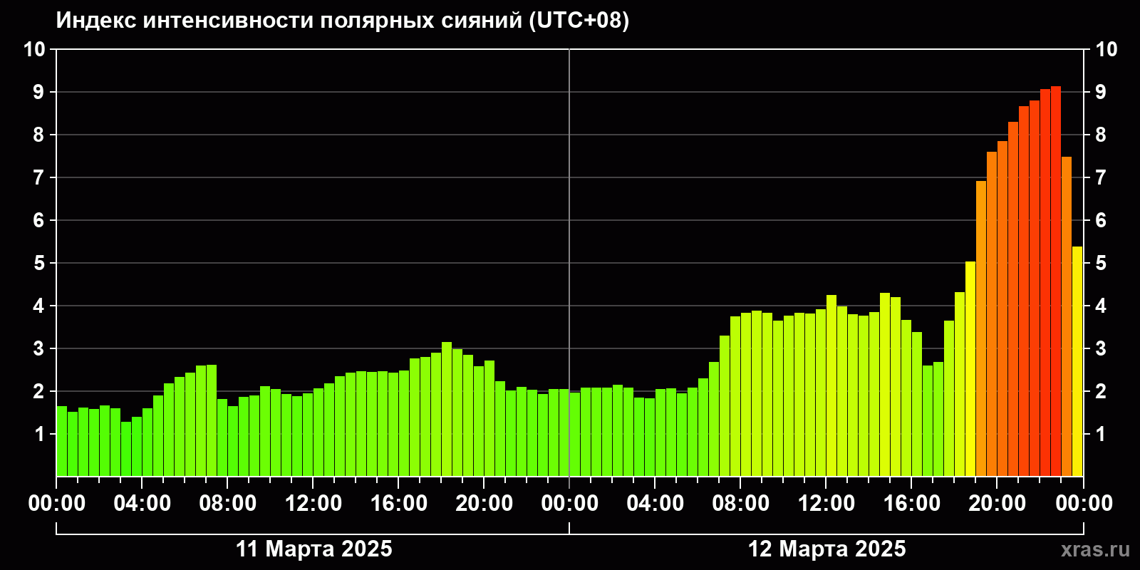 Изменения индекса интенсивности полярных сияний с 2025-03-11 по 2025-03-12 по местному времени