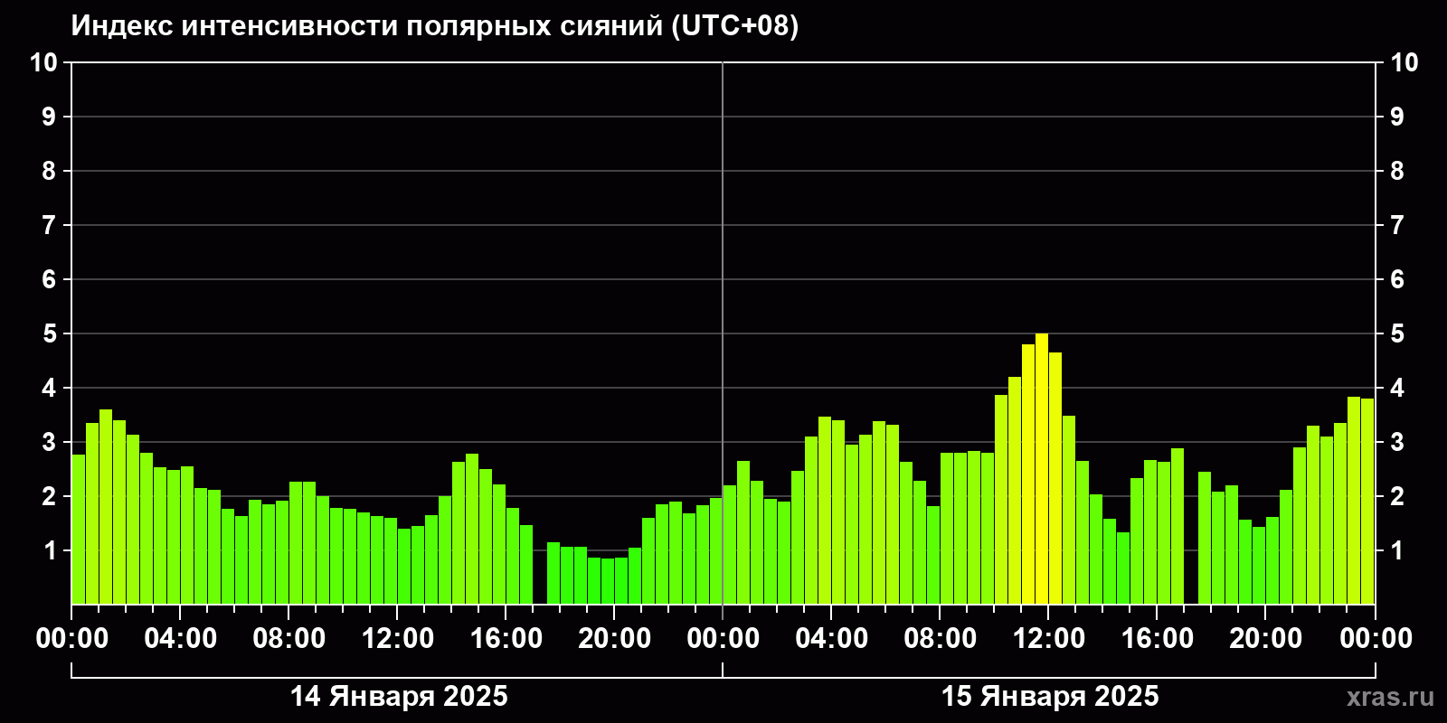 Изменения индекса интенсивности полярных сияний с 2025-01-14 по 2025-01-15 по местному времени