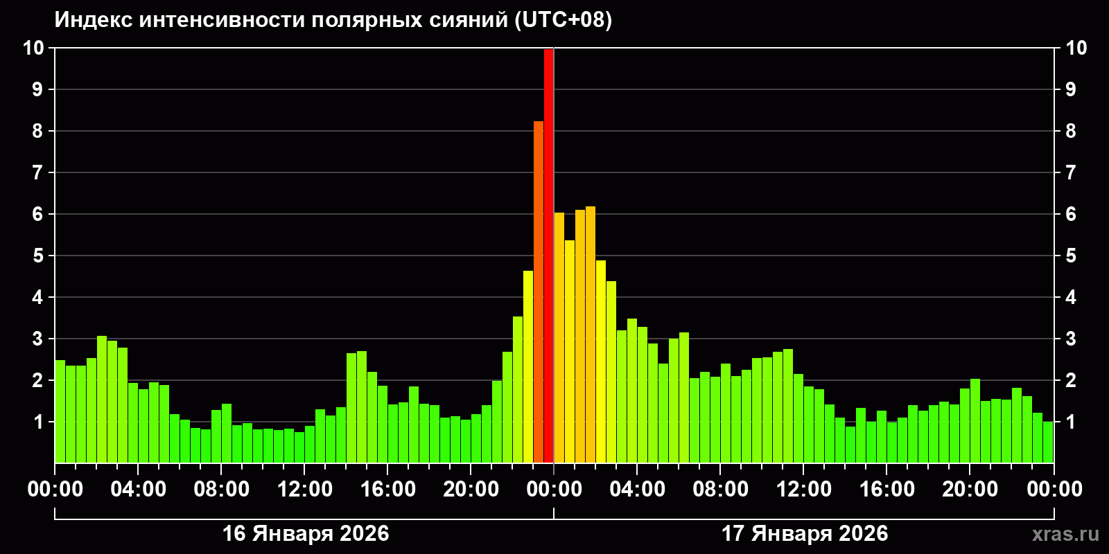 Изменения индекса интенсивности полярных сияний с 2026-01-16 по 2026-01-17 по местному времени