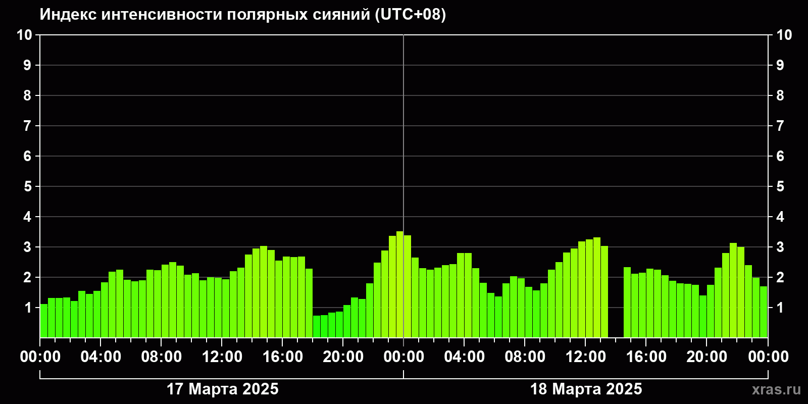 Изменения индекса интенсивности полярных сияний с 2025-03-17 по 2025-03-18 по местному времени