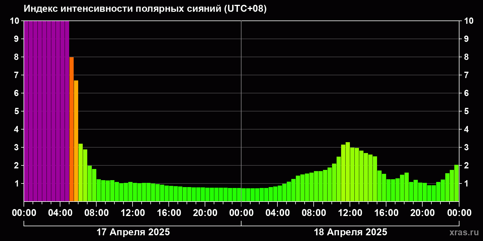 Изменения индекса интенсивности полярных сияний с 2025-04-17 по 2025-04-18 по местному времени