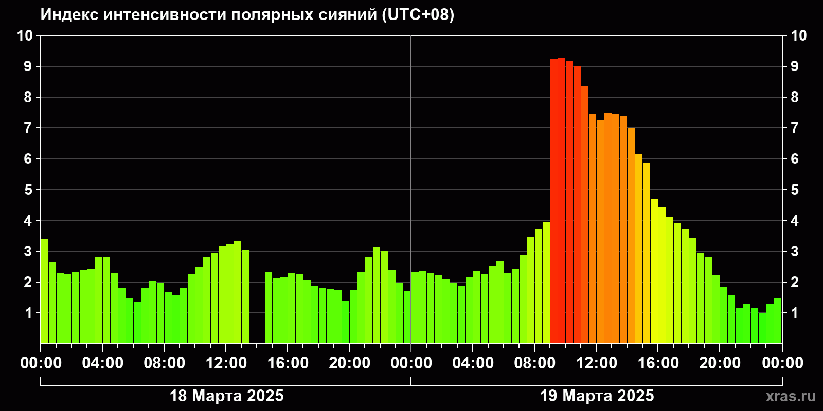 Изменения индекса интенсивности полярных сияний с 2025-03-18 по 2025-03-19 по местному времени
