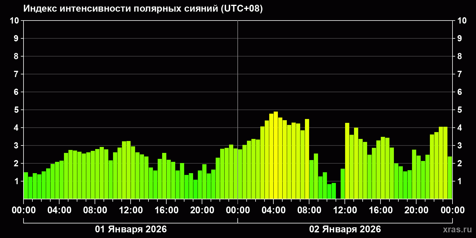 Изменения индекса интенсивности полярных сияний с 2026-01-01 по 2026-01-02 по местному времени