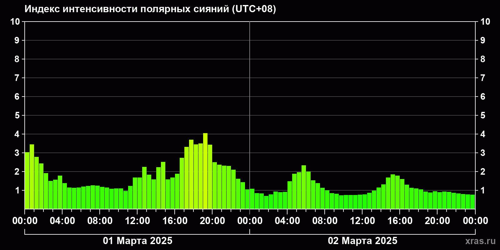 Изменения индекса интенсивности полярных сияний с 2025-03-01 по 2025-03-02 по местному времени